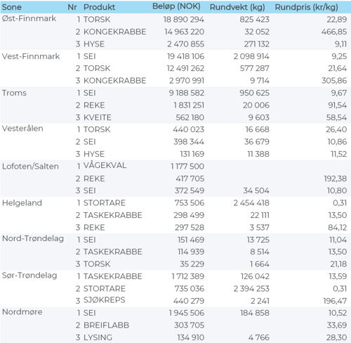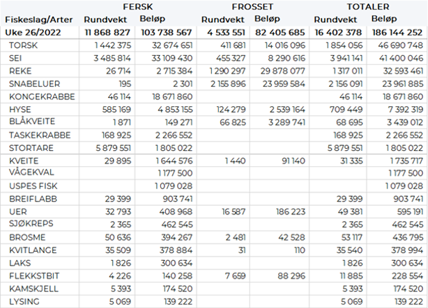 Omsetningen av ferskt råstoff i uke 26 utgjorde 104 millioner kroner, som var på samme nivå som uka før. Seien og torsken var jevnstor i verdi med 33 millioner kroner på hver, fulgt av kongekrabben med nær 19 millioner kroner som en god nr 3.
