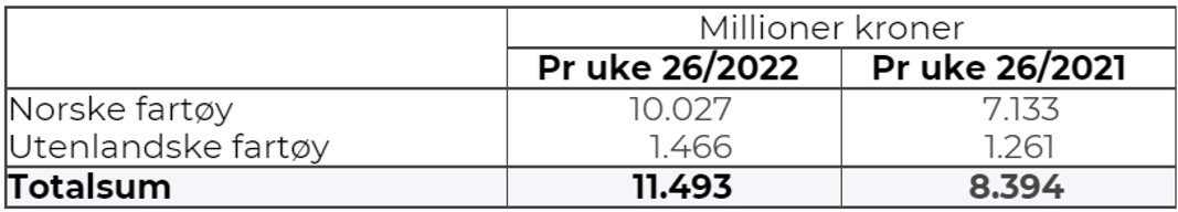 Totalomsetningen hittil i år sammenlignet med tilsvarende periode i fjor framgår av tabell 1. Omsetningen for norske båter nådde 10 milliarder kroner i løpet av uke 26! Den økte omsetningen for norske båter er på 2,9 milliarder kroner, fordelt med pluss på 2,0 på fersk- og 0,9 på frystomsetningen. Frystomsetningen pr uke 26 i år er på 3.857 millioner kroner, mens ferskomsetningen er oppe i 6.168 millioner kroner. En stor del av den økte frystomsetningen skriver seg fra sluttspurten i 2021 der kvantumet er omsatt på begynnelsen av 2022. Men økt omsetning av fryst råstoff også i uke 6, da foreløpig ukerekord ble satt med 275 millioner kroner, en rekord som ble slått i uke 12 da med 290 millioner kroner. Omsetningen av fryst torsk pr uke 26 i år er 1.832 millioner kroner mot 1.154 millioner kroner til samme tid i fjor, av kvantum på henholdsvis 60.300 og 56.250 tonn. Når det gjelder omsetningen av fersklevert råstoff, drar torsken opp pga. økte priser til tross for redusert kvantum. Kvantum fersk torsk omsatt så langt er 185.110 tonn, mot 190.390 tonn til samme tid i fjor, mens verdien er opp fra 3.060 til 4.530 millioner kroner.