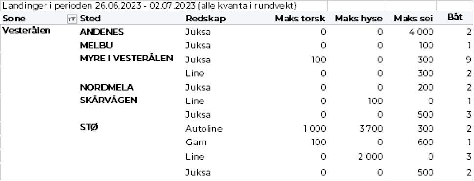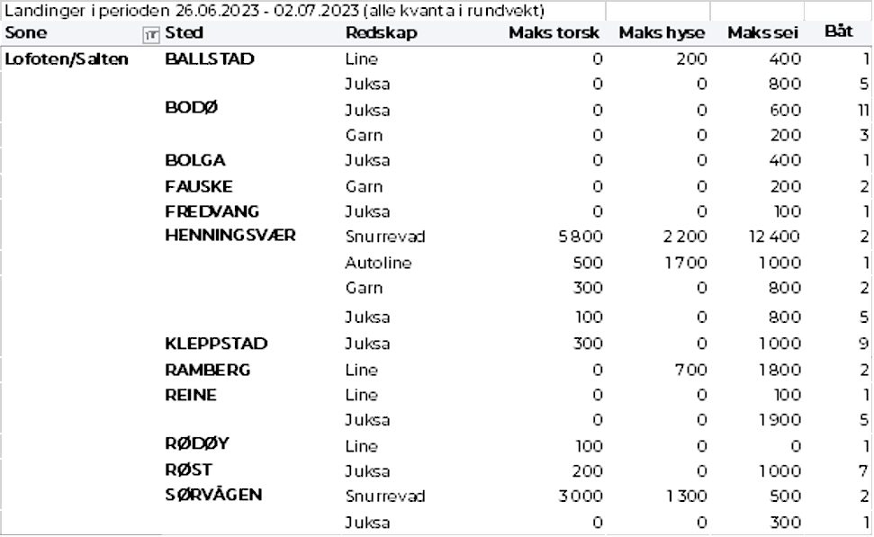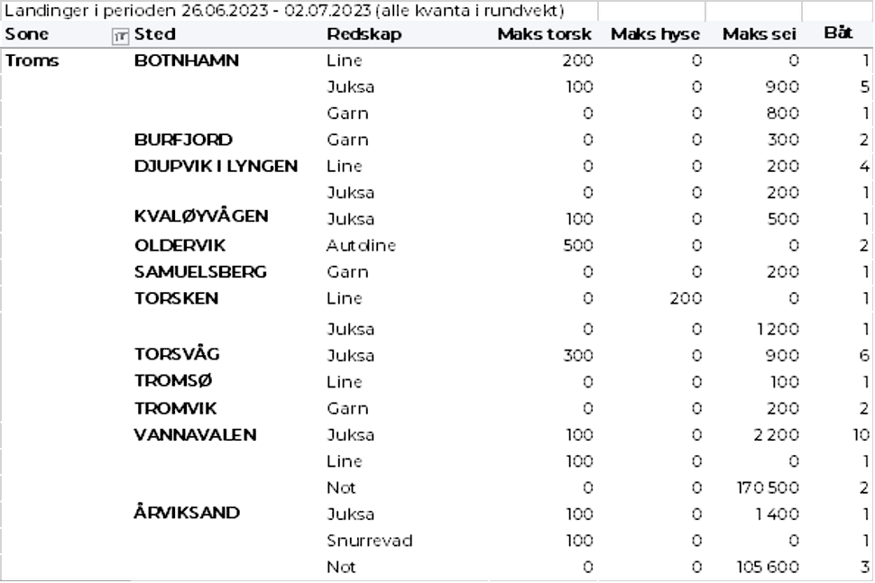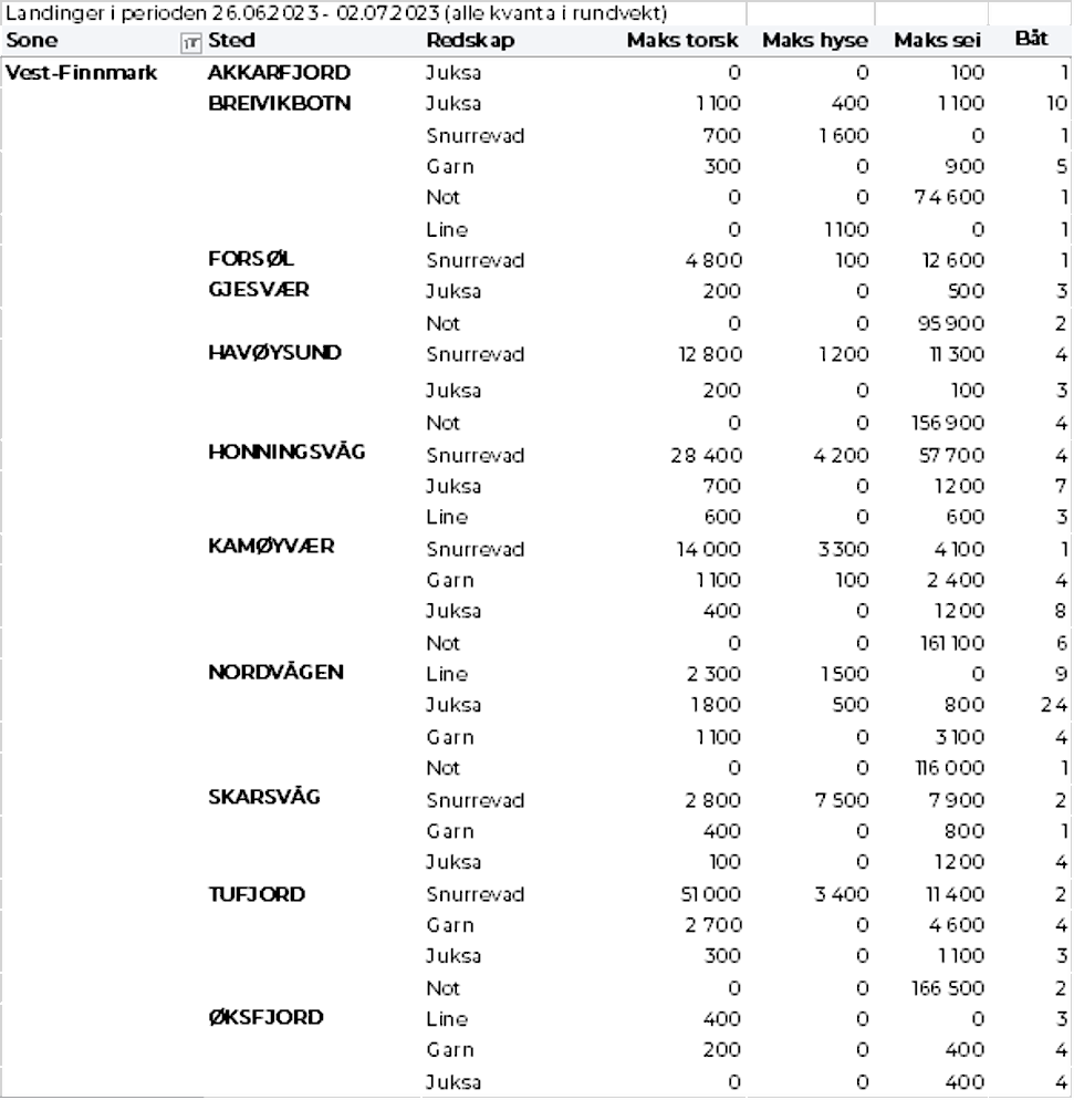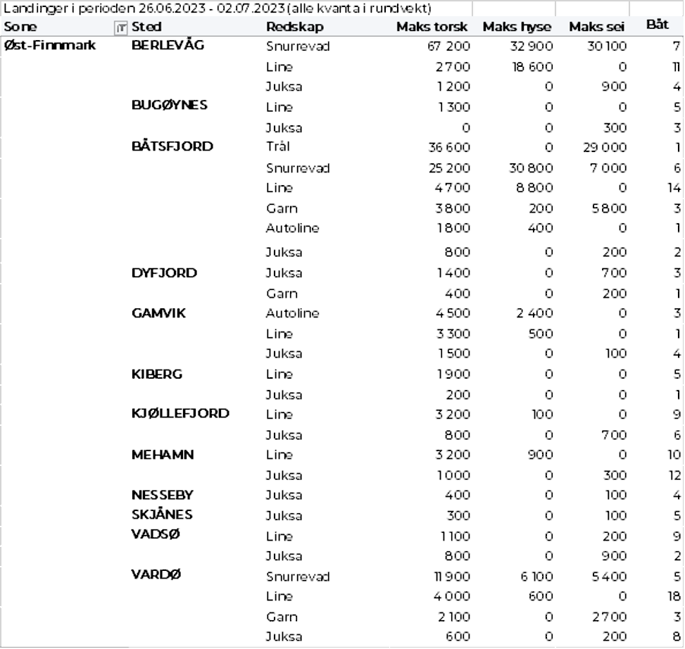 Omsetningen av fersk torsk i uke 26 utgjorde 778 tonn til verdi 21 millioner kroner, en økning fra 650 tonn/ 17 millioner kroner uken før. Høyest kvantum levert i Øst-Finnmark med 779 tonn hvorav 458 tonn kom fra snurrevad og 218 tonn fra line/autoline. I Vest-Finnmark var det levert 349 tonn, hvorav 279 tonn kom fra snurrevad. I Lofoten var det levert 23 tonn, hvorav 16 tonn kom fra snurrevad. Kvanta under 6 tonn i resterende soner.