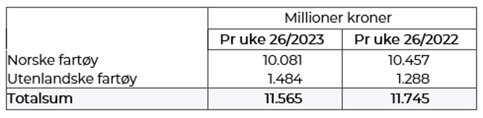 Tilsvarende for uke 26 i fjor var omsetningen 251 millioner kroner, hvorav utenlandske leveranser utgjorde 32 millioner kroner. Omsetningen for norske båter på 219 millioner kroner var fordelt med 106 på fersk og 112 på fryst råstoff.