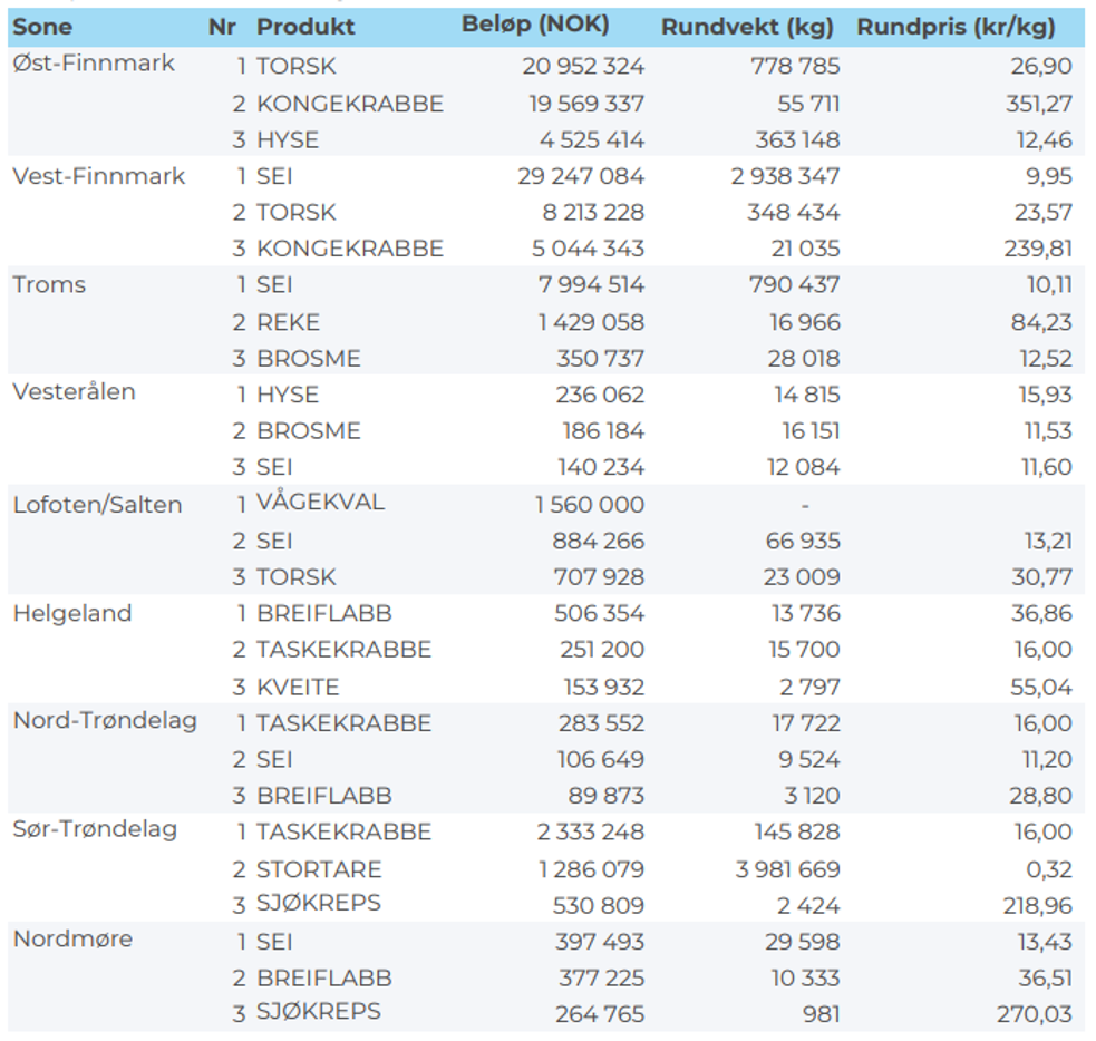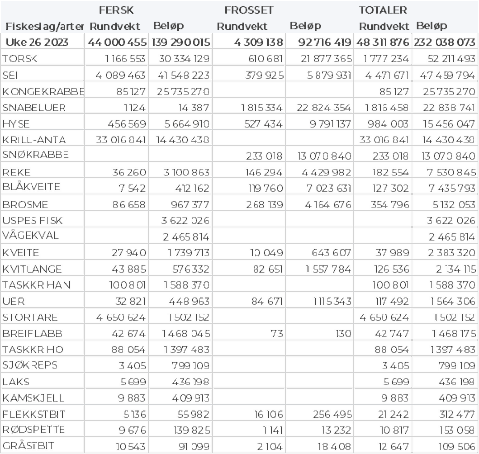 Omsetningen av ferskt råstoff i uke 26 ble 139 millioner kroner, som er en liten økning fra 118 millioner kroner uka før. Sei, torsk og kongekrabbe stod for det meste av verdiene med henholdsvis 42, 30 og 26 millioner kroner, og for øvrig slik det framgår av tabell 2.