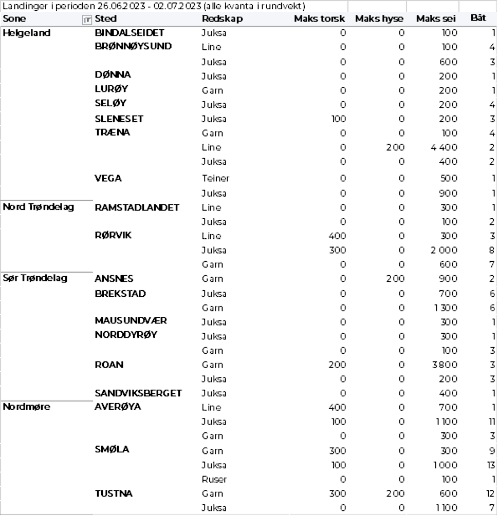 Nok en god uke for omsetningen av fersk sei, 4.089 tonn til verdi 42 millioner kroner ble levert i løpet av uke 26. En nedgangen fra 5.377 tonn/ 54 millioner kroner uken før, men fortsatt betydelig aktivitet. Notfisket er klart størst og står for 3.215 tonn av totalen til verdi 32 millioner kroner. Fordelt per sone er det klart størst aktivitet i Vest-Finnmark der 2.938 tonn av totalen er levert. Av dette står not for 2.448 tonn, levert til 6 kjøpere. I Troms er det levert 790 tonn, hvorav 766 tonn kom fra not. Deretter følger 218 tonn levert i Øst-Finnmark, hvorav 124 tonn kom fra snurrevad. Lofoten fikk leveranser av totalt 67 tonn, hvorav 37 tonn kom fra juksa. Kvanta under 30 tonn i resterende soner.