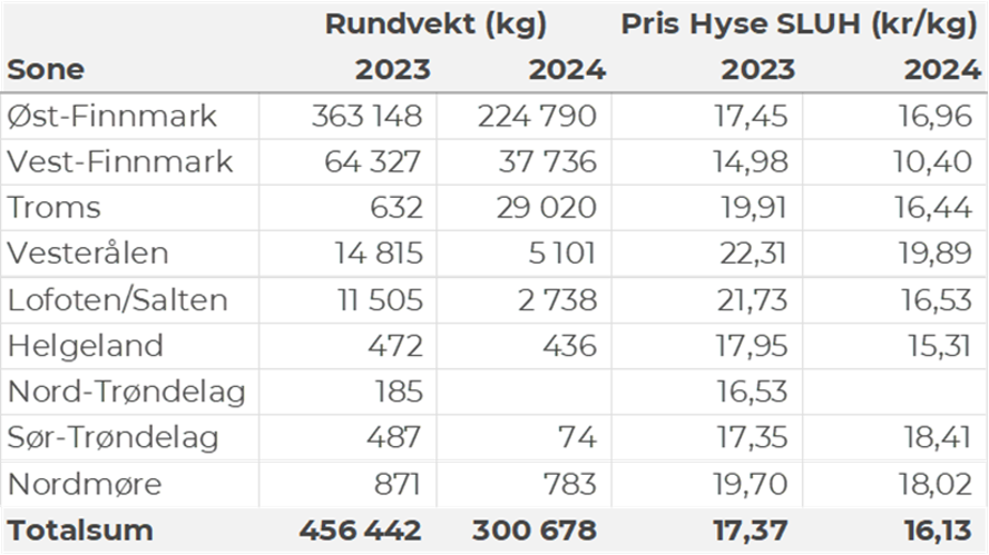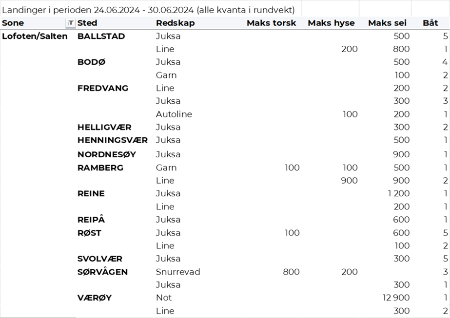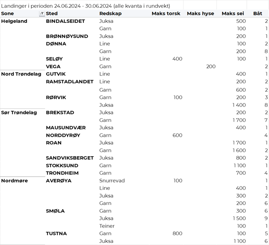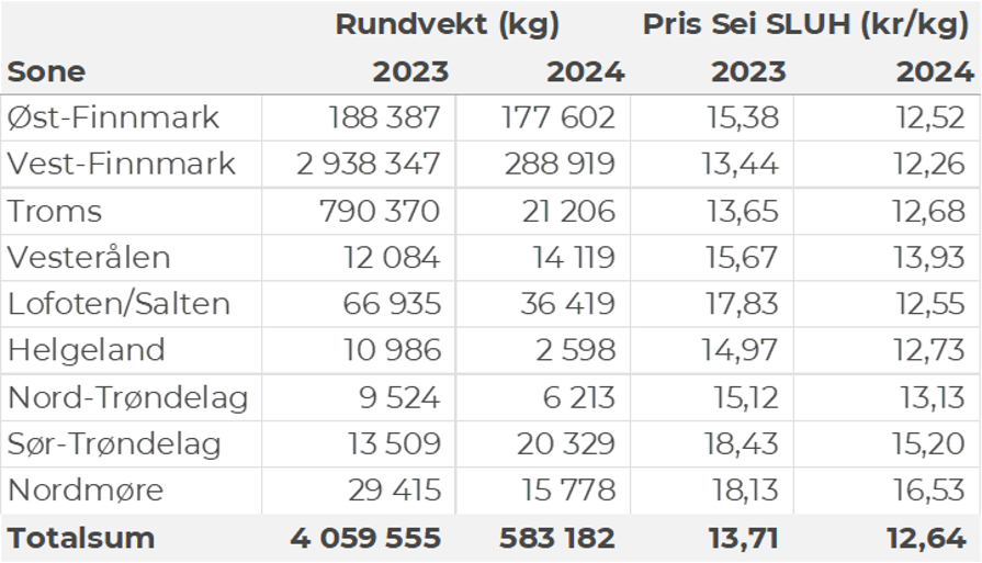 Omsetningen av fersk sei i uke 26 utgjorde 580 tonn til en verdi av 5,5 millioner kroner. En nedgang fra 820 tonn/7,4 millioner kroner uken før. Fangstene fordeler seg med 370 tonn tatt med snurrevad, 120 tonn på garn, 60 tonn på juksa og bare vel 10 tonn hver på not og lina. Størst aktivitet i Vest-Finnmark som står for 290 tonn av totalen, etterfulgt av Øst-Finnmark med 180 tonn og Lofoten/Salten med 40 tonn. Kvanta under 22 tonn per sone for resterende, jf. tabell 4.