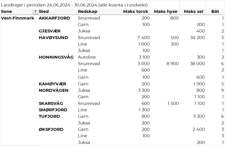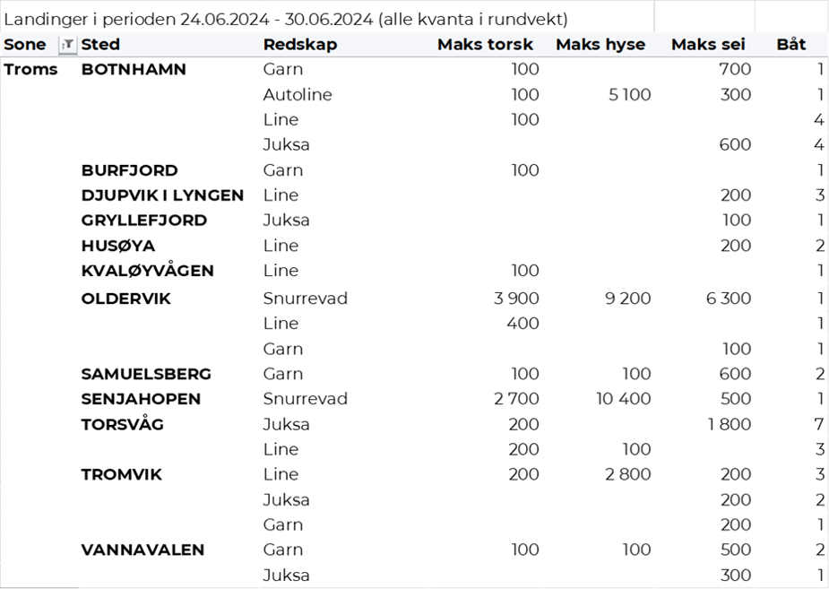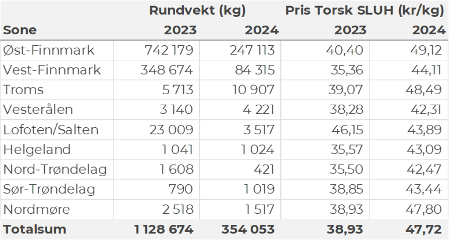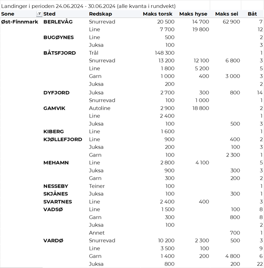 Omsetningen av fersk torsk i uke 26 utgjorde 500 tonn til verdi 16 millioner kroner, som var litt opp sammenlignet med uke 25. Mest levert til Øst-Finnmark som står for nær 400 tonn av totalen. Etterfulgt av Vest-Finnmark med 80 tonn og 10 tonn i Troms. Kvanta fra 4 tonn og lavere per leveringssone for resterende. Fordelt på redskap er 150 tonn tatt på hver av snurrevad og trål, 120 tonn på line/autoline, 50 tonn på juksa og 30 tonn på garn. Trålkvantumet kom fra en leveranse i Båtsfjord. Snurrevadkvantumet var i hovedsak fordelt med 90 tonn levert Øst-Finnmark og 50 tonn levert Vest-Finnmark. Også line-, juksa- og garnkvantumet var i hovedsak levert i Øst-Finnmark.