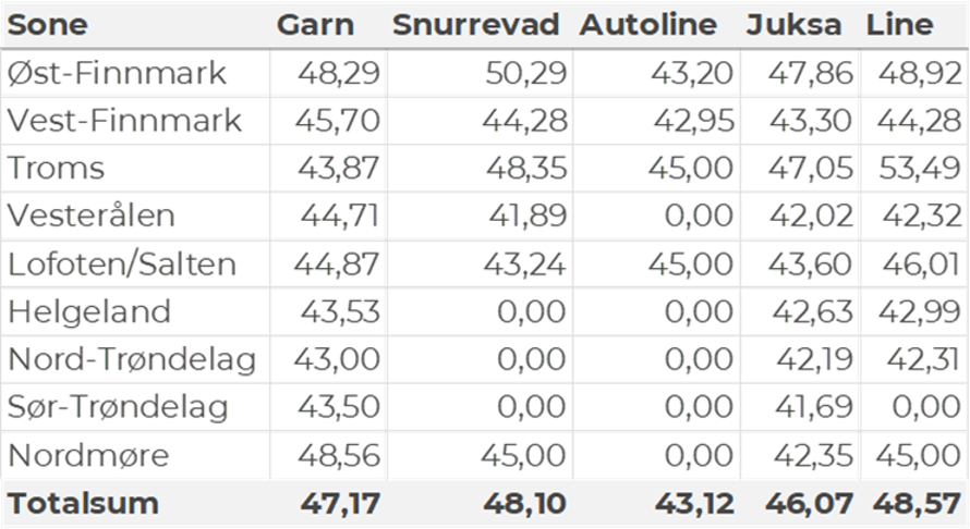 Tabell 2 og 3 viser fordelingen av landingene av fersk torsk pr leveringssone og redskap (unntatt trål), med tilhørende snittpriser. De to tabellene er basert på omsetning av kvalitet A og ekstra, der alle leveringstilstander inngår, men der snittprisene er omregnet til sløyd uten hode-priser, eksklusiv restråstoff.