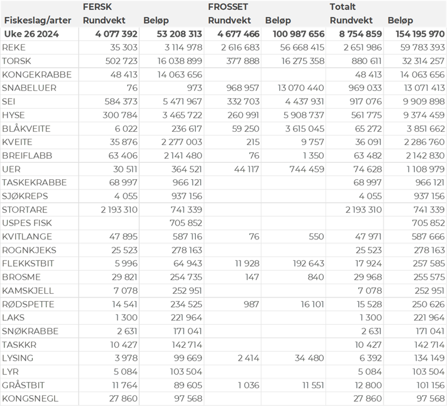 Foreløpige tall for norske båter i perioden viser 101 millioner kroner, ned fra 105 millioner kroner i uke 25. Omsetningen i uke 26 bestod i hovedsak av vel 2.600 tonn reker til en verdi av 57 millioner kroner. Etterfulgt av 380 tonn torsk til en verdi av 16 millioner kroner og 970 tonn snabeluer som ga en verdi på 13 millioner kroner. Kvantum og verdi for andre arter fremgår av tabell 1.