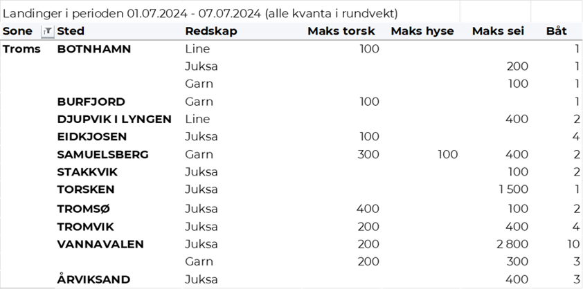I løpet av uke 27 ble omsatt 38 tonn ferske reker til en verdi av 3,5 millioner kroner, som var litt opp sammenlignet med uken før. Størst kvantum fanget i Varangerfjorden som står for 27 tonn av totalen, deretter følger Lyngenfjorden med 6 tonn og Reisafjorden med 3 tonn. Kvanta under 0,6 tonn i resterende soner og fangstfelt. Hittil i år er det omsatt 687 tonn ferske reker til verdi 60,4 millioner kroner. Til samme tid i fjor var det omsatt 555 tonn til verdi 49,7 millioner kroner.
