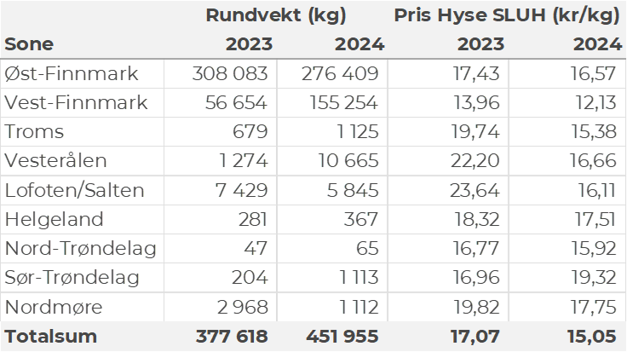 Kvantumet fersklevert hyse i uke 27 var 450 tonn til en verdi av 4,9 millioner kroner, som var opp fra 300 tonn/3,5 millioner kroner uken før. Snurrevad står for 320 tonn av totalen, etterfulgt av 115 tonn fra line/autoline. Det meste leveres i Øst-Finnmark som står for 275 tonn av totalen, deretter følger Vest-Finnmark med 160 tonn og Vesterålen med 10 tonn. Den geografiske fordelingen framgår av tabell 5.