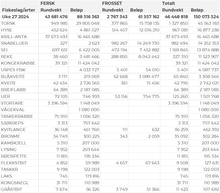 Foreløpige tall for norske båter i perioden viser 62 millioner kroner, ned fra 106 millioner kroner i uke 26. Omsetningen i uke 27 var i hovedsak fordelt på torsk, snabeluer, hyse, reke, sei og blåkveite slik det framgår av tabell 1.