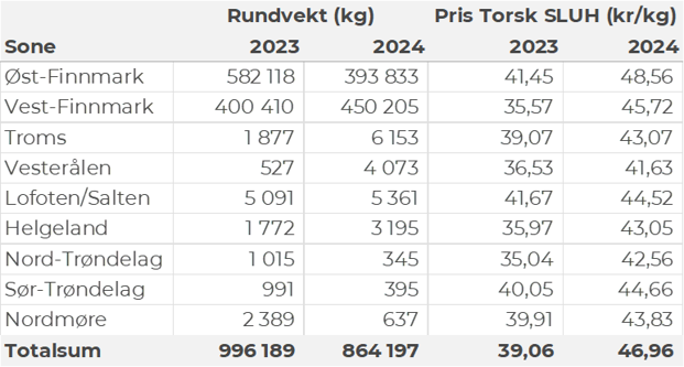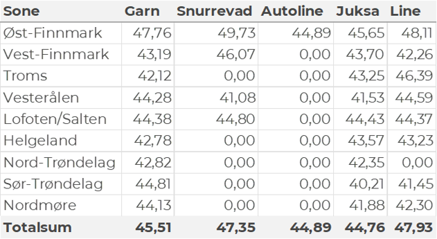 Tabell 2 og 3 viser fordelingen av landingene av fersk torsk pr leveringssone og redskap (unntatt trål), med tilhørende snittpriser. De to tabellene er basert på omsetning av kvalitet A og ekstra, der alle leveringstilstander inngår, men der snittprisene er omregnet til sløyd uten hode-priser, eksklusiv restråstoff.