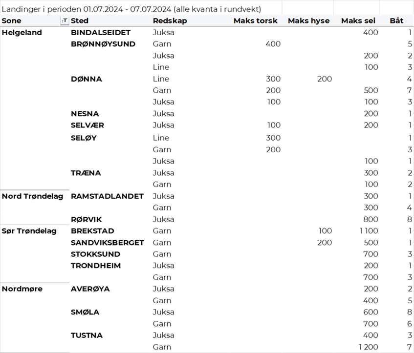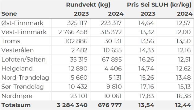 Omsetningen av fersk sei i uke 27 utgjorde 700 tonn til en verdi av 6,4 millioner kroner. Opp fra 580 tonn/5,5 millioner kroner uken før. Fangstene fordeler seg med 320 tonn tatt med snurrevad, 220 tonn på garn, 120 tonn på juksa og mindre kvanta på trål og lina. Størst aktivitet i Vest-Finnmark som står for 320 tonn av totalen, etterfulgt av Øst-Finnmark med 240 tonn og Lofoten/Salten med 70 tonn. Mindre kvanta i resterende områder, jf. tabell 4.