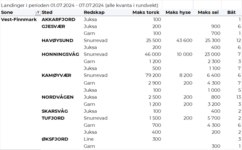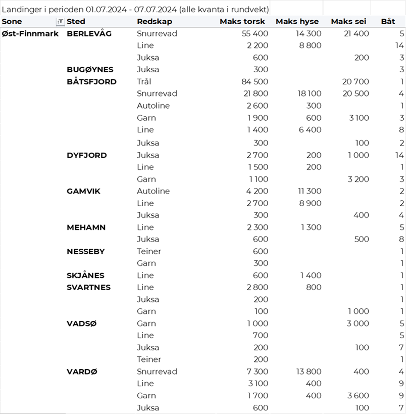 Den største aktiviteten er det kystfiskeflåten som befinner seg i Finnmark som står for, i en relativt rolig sommerperiode. De største leveransene gjøres av båtene som fisker med redskap snurrevad i dette området, der fangstene gjerne består av en blanding av fremfor alt torsk, hyse og sei. For øvrig så fiskes det fortsatt et mangfold av arter langs kysten i større eller mindre grad, slik som kongekrabbe, kystreke, kveite, breiflabb og kvitlange.