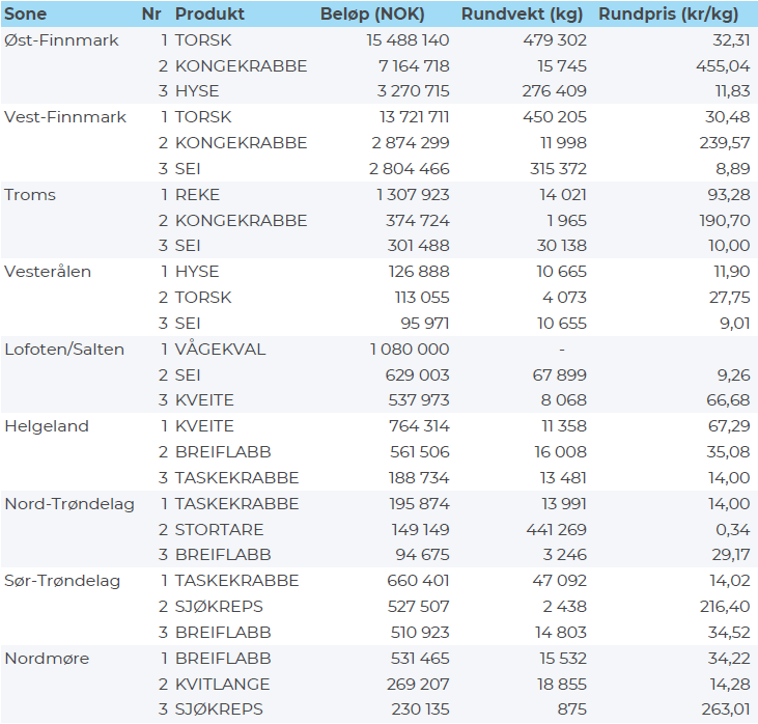 Omsetningen av ferskt råstoff i uke 27 utgjorde 88 millioner kroner, opp fra 53 millioner kroner uken før. Fordelt per art er det torsken som ligger på topp med 30 millioner av totalen, etterfulgt av kongekrabbe til verdi 11 millioner og sei til verdi 6 millioner. Verdier fra 5 millioner og lavere per art for resterende, verdier for alle arter fremgår av tabell 1. Til sammenligning hadde vi samme uka i fjor en ferskomsetning på 103 millioner kroner, da med nær 3.400 tonn sei som hovedart til verdi 34 millioner kroner, der 2.300 tonn var tatt på not.