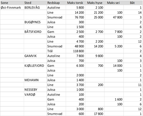 Omsetningen av ferskt råstoff i uke 28 utgjorde totalt 64,7 mill kroner. Også her var torsken størst i verdi med 18,3 mill kroner fra et kvantum på 1.130 tonn. Kvantumet var litt opp og verdien litt ned sammenlignet med uka før. Tallene er inkludert alle kvaliteter, biprodukter og etterbetaling. Av kvantumet i uke 28 var 810 tonn omsatt til kjøpere i Øst-Finnmark, 300 tonn i Vest-Finnmark, og ellers beskjedne kvanta i øvrige områder. Av kvantumet levert Øst-Finnmark var 350 tonn tatt på snurrevad, 240 tonn tatt på line/autoline, 180 tonn på trål, 20 tonn på garn og 9 tonn på juksa. Kvantumet levert Vest-Finnmark var i hovedsak tatt på snurrevad med 250 tonn.