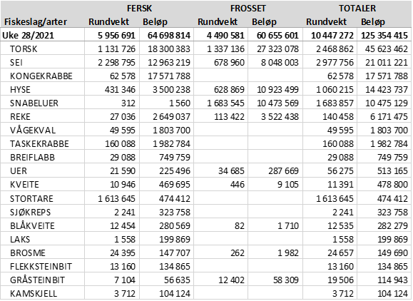 Tabell 2. Omsetning for norske båter i uke 28/2021, fordelt pr fersk/fryst og pr fiskeslag