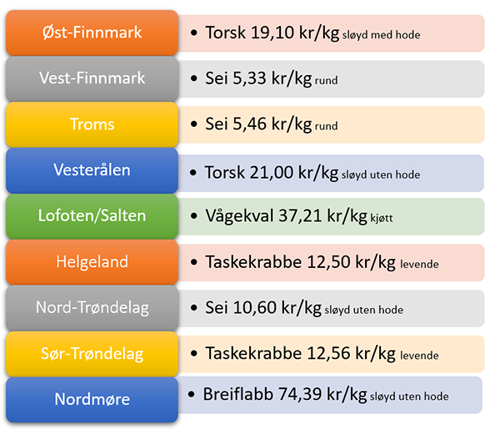 Art med størst verdi i sine områder og snittpris til fisker