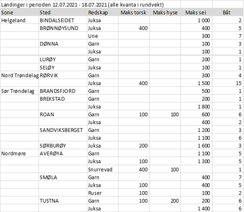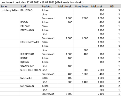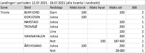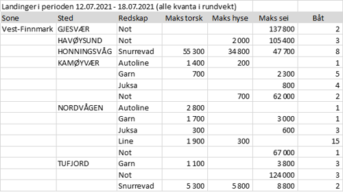 Fisket fordelt på fiskevær i Råfisklagets distrikt for uke 28 i 2021 med fokus på torsk, hyse og sei, framgår av tabellene nedenfor. Oversikten viser største enkeltfangst i rund vekt per sted for de ulike redskapene og antall båter per redskap per sted. Generelt laber aktivitet utenom Finnmark, litt notsei i Troms, og spredt fiske med juksa, snurrevad og garn fra Lofoten og sør. Bare en enslig juksaleveranse i Vesterålen sist uke, som er så labert at det ikke kommer med i tabellen for Vesterålen.