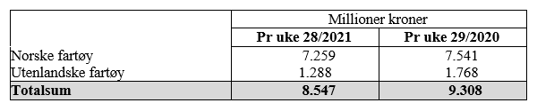 Tilsvarende uke i fjor, som var uke 29 (13.- 19. juli 2020) var omsetninga 120 mill kroner, hvorav 8 mill kroner kom etter landing fra utenlandske båter. Omsetningen for norske båter var 112 mill kroner, fordelt med 66 på fersk og 46 på fryst råstoff.