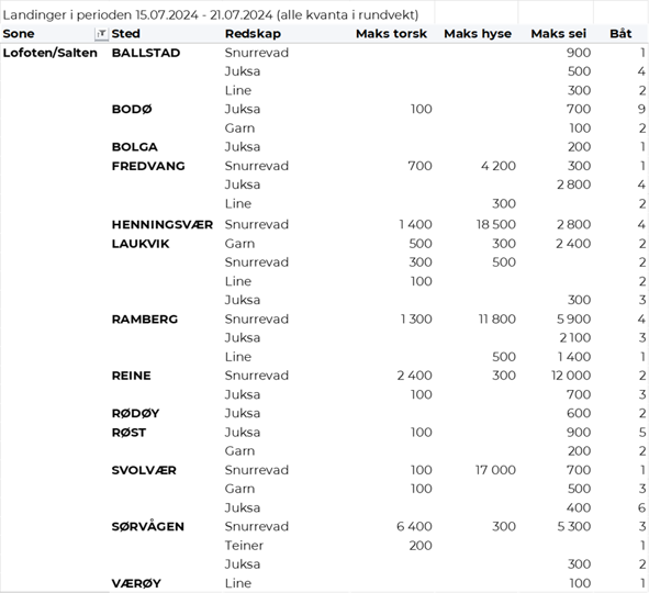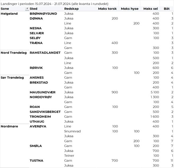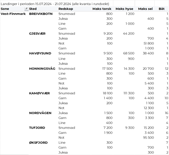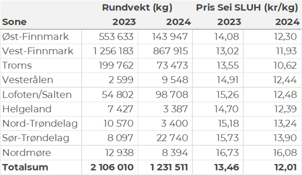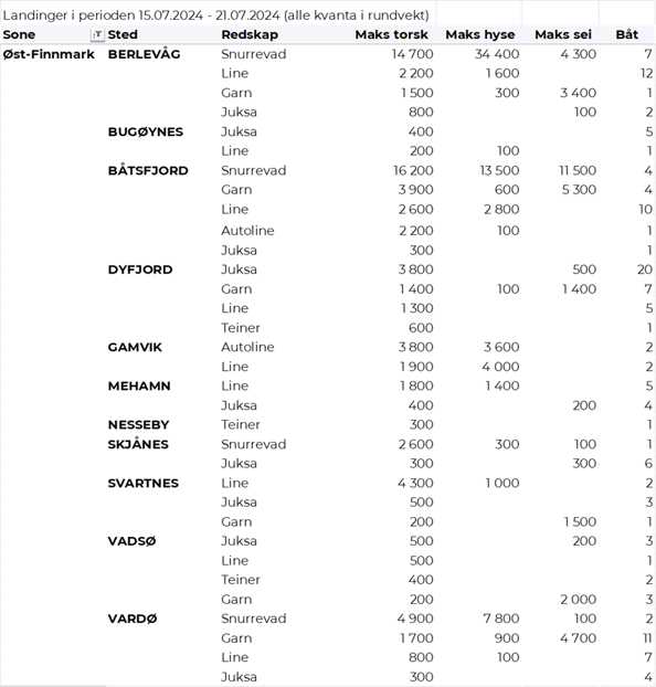Omsetningen av fersk sei i uke 29 utgjorde 1.230 tonn til en verdi av 11 millioner kroner. Opp fra 1.000 tonn/9,1 millioner kroner uken før. Fangstene fordeler seg med 430 tonn tatt med snurrevad, 420 tonn på not, 280 tonn på garn, 90 tonn på juksa og mindre kvanta på lina. Fremdeles labert seinotfiske, men deltakelsen er økende. Størst aktivitet i Vest-Finnmark som står for 870 tonn av totalen, etterfulgt av Øst-Finnmark med 140 tonn, Lofoten/Salten med 100 tonn og Troms med 70 tonn. Mindre kvanta i resterende områder, jf. tabell 4.