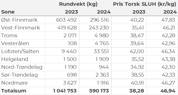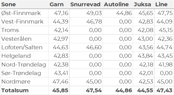 Tabell 2 og 3 viser fordelingen av landingene av fersk torsk pr leveringssone og redskap (unntatt trål), med tilhørende snittpriser. De to tabellene er basert på omsetning av kvalitet A og ekstra, der alle leveringstilstander inngår, men der snittprisene er omregnet til sløyd uten hode-priser, eksklusiv restråstoff.