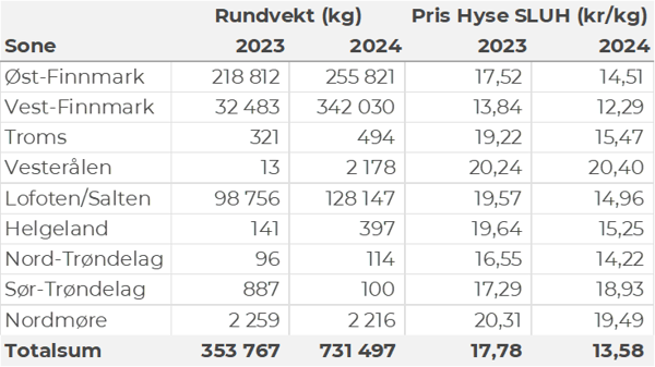 Kvantumet fersklevert hyse i uke 29 var 730 tonn til en verdi av 7,1 millioner kroner, som var på samme nivå som uken før. Snurrevad står for 650 tonn av totalen, etterfulgt av 60 tonn fra line/autoline. Størst kvantum levert Vest-Finnmark som står for 340 tonn av totalen, deretter følger Øst-Finnmark med 260 tonn og Lofoten med 130 tonn. Den geografiske fordelingen av hyselandingene framgår av tabell 5.