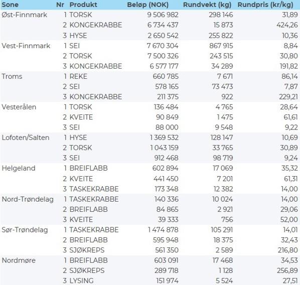 Omsetningen av ferskt råstoff i uke 29 utgjorde 68 millioner kroner, ned fra 75 millioner kroner uken før. Fordelt per art er det torsken som ligger på topp med 19 millioner av totalen, etterfulgt av kongekrabbe til verdi 15 millioner og sei til verdi 11 millioner. Verdier fra 7 millioner og lavere per art for resterende, verdier for alle arter fremgår av tabell 1. Til sammenligning hadde vi samme uka i fjor en ferskomsetning på 86 millioner kroner, da både torsken, seien og kongekrabben stod for høyere verditall enn i år.