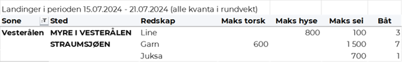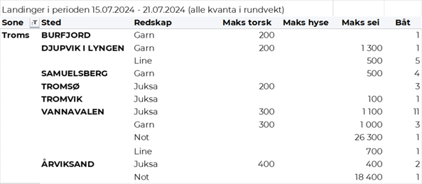 I løpet av uke 29 ble omsatt 32 tonn ferske reker til en verdi av 3,1 millioner kroner, ned fra 46 tonn og 4,0 millioner kroner uka før. Størst kvantum fanget i Varangerfjorden som står for 22 tonn av totalen, deretter følger Lyngenfjorden med 2,7 tonn, Dønna med 1,8 tonn og Ullsfjorden med 1,7 tonn. Kvanta under 1 tonn i resterende soner og fangstfelt. Hittil i år er det omsatt 773 tonn ferske reker til verdi 68,7 millioner kroner. Til samme tid i fjor var det omsatt 630 tonn til verdi 57,3 millioner kroner.
