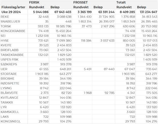 Tabell 1: Omsetning for norske båter i uke 29/2024, fordelt pr fersk/fryst og pr fiskeslag.