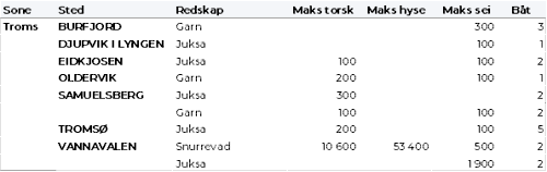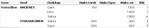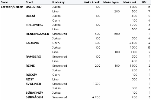 Tabell 2 og 3 viser fordelingen av landingene av fersk torsk per leveringssone og redskap (unntatt trål), med tilhørende snittpriser. De to tabellene er basert på omsetning av kvalitet A og ekstra, der alle leveringstilstander inngår, men der snittprisene er omregnet til sløyd uten hode-priser, eksklusiv restråstoff.