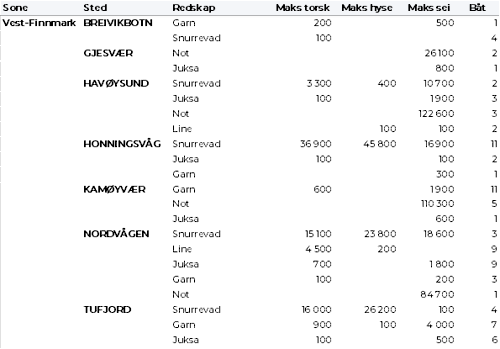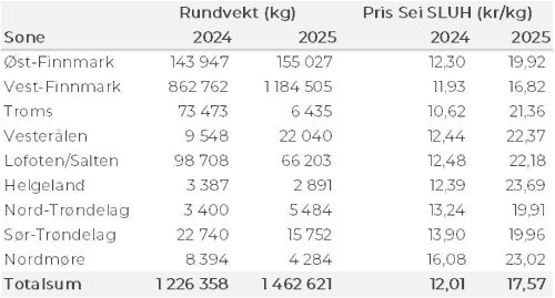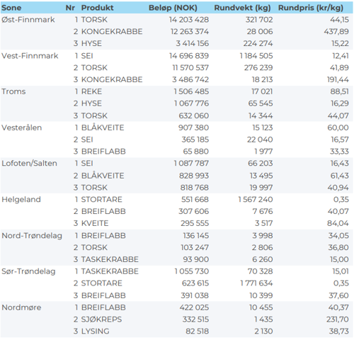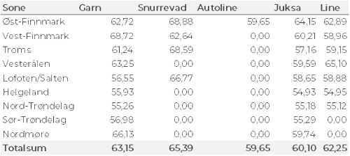 Kvanta fordelt per leveringssone fremgår av tabell 2. 93 % av kvantumet var levert i Finnmark.