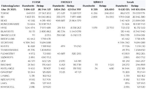 Foreløpige tall for omsetningen av fryst råstoff fra norske båter i uke 29 viser 62 millioner kroner, ned fra 103 millioner kroner uka før . Størst verdi i uke 29 kom fra reke, torsk, hyse og sei med henholdsvis 22, 11, 8 og 8 millioner kroner. For øvrig vises til tabell 1.