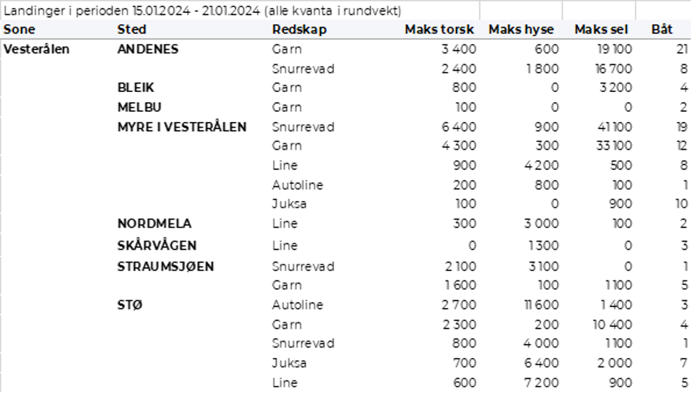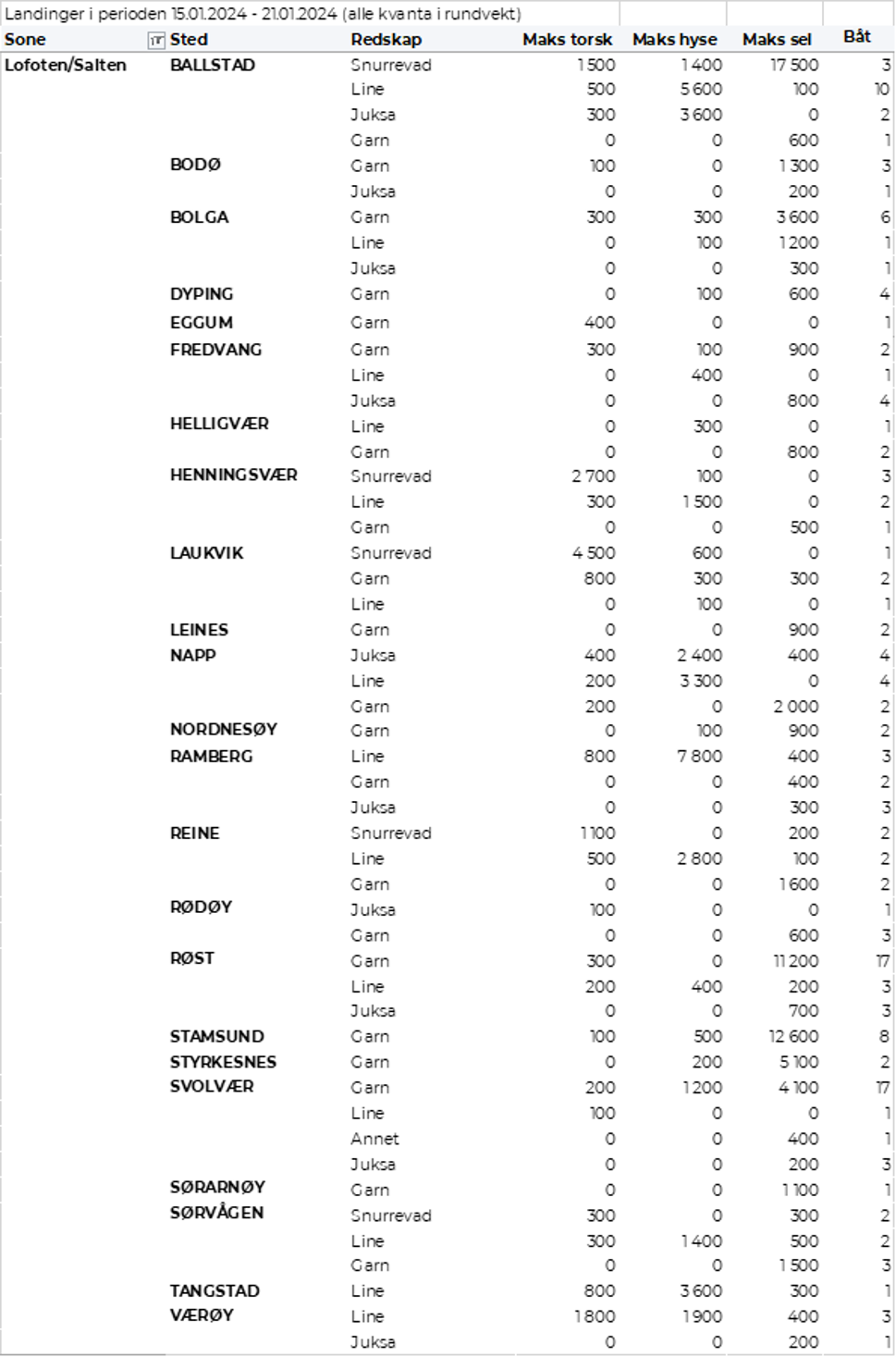 I løpet av uke 3 ble det omsatt 1.226 tonn fersk vassild til en verdi av 9,44 millioner kroner. Fangstene er levert av 5 trålere som alle har fisket på Træna-Egga og Skjoldryggen. Hittil i år er det levert 1.864 tonn fersk vassild til en verdi av 14,4 millioner kroner.