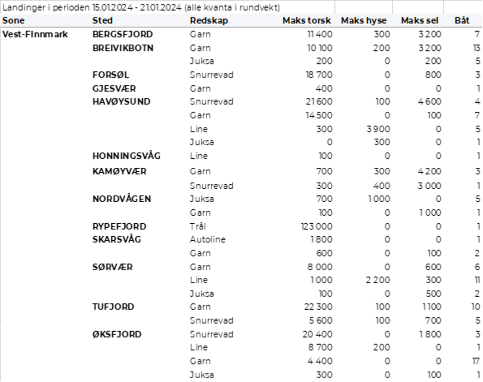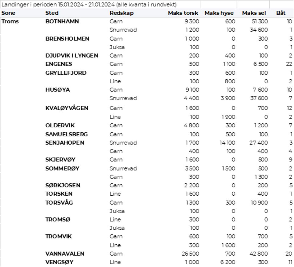 Omsetningen av fersk torsk utgjorde 2.360 tonn til verdi 85 millioner kroner, som var opp fra 1.420 tonn og 54 millioner kroner i uke 2. 1.240 tonn var tatt på garn, snurrevad stod for 670 tonn, trål for 250 tonn og lina for 200 tonn. 710 tonn av garntorsken var levert i Vest-Finnmark, 380 i Troms og 120 tonn i Vesterålen. Det meste av snurrevadtorsken, 340 tonn, var omsatt til kjøpere i Øst-Finnmark. 225 tonn var levert i Vest-Finnmark, ellers spredt. Også linetorsken var i hovedsak levert i Øst-Finnmark. Tråltorsken var i hovedsak levert i Vest-Finnmark. Av totalen var dermed 1.190 tonn levert i Vest-Finnmark, 475 tonn i Øst-Finnmark, 420 tonn i Troms, 200 tonn i Vesterålen og 50 tonn i Lofoten. Fremdeles mest sei i fangstene fra Troms til Lofoten, der garnbåtene drifter med seigarn. Men andelen torsk er økende.