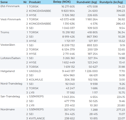 Foreløpige tall for fryst råstoff fra norske båter i perioden viser 63 millioner kroner. 1.080 tonn fryst torsk var størst i verdi med 37 millioner kroner, fulgt av 900 tonn sei og 430 tonn snabeluer verdt henholdsvis 11 og 6 millioner kroner.