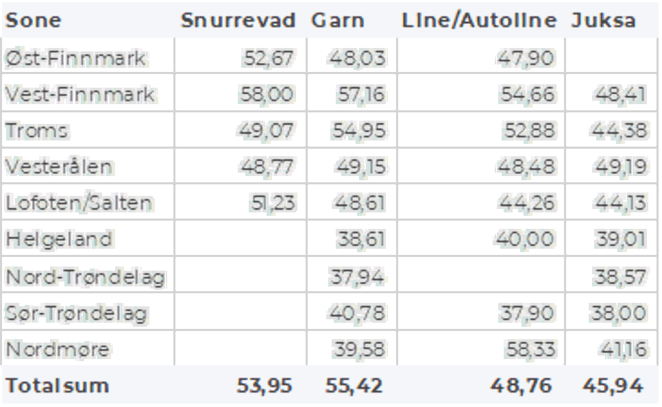 Som vanlig tidlig på et nytt år er det mye som dreier seg om torsk og sei, og tabell 2 og 3 viser fordelingen av landingene av fersk torsk pr leveringssone og redskap (unntatt trål), med tilhørende snittpriser. De to tabellene er basert på omsetning av kvalitet A og ekstra, der alle leveringstilstander inngår, men der snittprisene er omregnet til sløyd uten hode-priser, eksklusiv restråstoff.