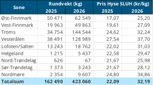 Kvantumet fersklevert hyse i uke 3 er 424 tonn til en verdi på 9,7 millioner kroner, opp fra 164 tonn til 2,6 millioner kroner samme uke i fjor. Hittil i 2026 er det omsatt 823 tonn fersk hyse til 19 millioner kroner, dette er en reduksjon i kvantum fra samme periode i 2025, men en økning i verdi. For uke 3 er det størst aktivitet i Vesterålen og Troms med henholdsvis 129 og 144 tonn levert, til sammenligning ble det omsatt 38 og 35 tonn i Vesterålen og Troms i samme uke i fjor. Det er økt kvantum av fersk hyse i alle soner sammenlignet med samme uke i fjor, som var en uke preget av mye dårlig vær. Dette framgår også av tabell 5.