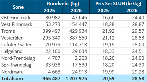 Omsetningen av fersk sei så langt i år utgjør 3.050 tonn til verdi 64 millioner kroner, ned fra 4.370 tonn og 67 millioner kroner i fjor til samme tid. Av årets kvantum er 1.800 tonn tatt på garn, 940 tonn på snurrevad, 120 tonn på line, 100 tonn på trål og 90 tonn på juksa. Tilsvarende i fjor var 2.240 tonn garnsei og 1.860 tonn tatt på snurrevad, dvs. kraftig reduksjon for begge redskap og spesielt for snurrevad, mindre endringer for line, trål og juksa. Geografisk er 1.070 tonn av årets kvantum levert i Vesterålen, 1.000 tonn i Troms, 480 tonn i Vest-Finnmark, 230 tonn i Lofoten/Salten, 130 tonn i Øst-Finnmark og 150 tonn i området Helgeland-Nordmøre. Tabell 4 viser den geografiske fordelingen av leveransene begrenset til uke 3, der årets kvantum er høyere enn i samme periode i fjor som følge av dårlig vær i uke 3 i fjor.