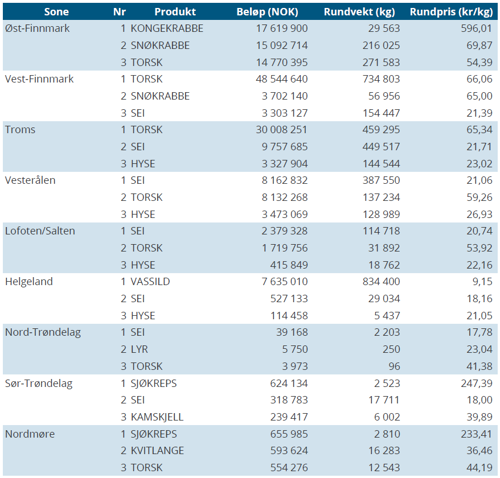 Omsetningen av fersk kongekrabbe i uke 3 havnet på 40 tonn til 20,4 millioner kroner. Av totalen var 39 tonn tatt i kvoteregulert område til 20,3 millioner kroner, tatt av 153 fartøy. I det uregulerte fisket var det omsatt 0,9 tonn til 94 tusen kroner, tatt av 10 fartøy.