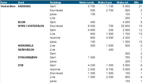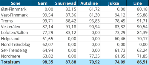 Tabell 2 og 3 viser fordelingen av landingene av fersk torsk per leveringssone og redskap (unntatt trål), med tilhørende snittpriser. De to tabellene er basert på omsetning av kvalitet A og ekstra, der alle leveringstilstander inngår, men der snittprisene er omregnet til sløyd uten hode-priser, eksklusivt restråstoff.