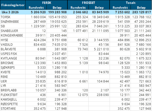 Råfisklagets omsetning i uke 3 utgjør 285 millioner kroner (foreløpig tall). Herav utenlandske fangster til verdi 2 millioner kroner. Norske fangster utgjorde dermed 283 millioner kroner, fordelt med 199 millioner kroner på fersk og 84 millioner kroner på fryst råstoff. Tallene for uke 3 utgjør en nedgang fra den samlede omsetningen for uke 1-2, når det var omsatt 365 millioner kroner fra norske fartøy, fordelt med 174 millioner kroner på fersk og 191 millioner kroner på fryst råstoff.