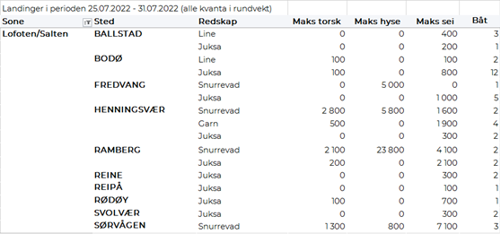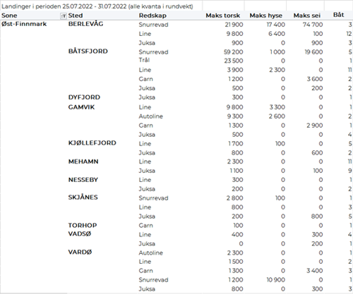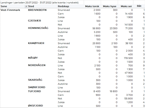 Omsetningen av fersk torsk gikk ned fra 1.354 tonn uka før. 500 tonn er levert i Øst-Finnmark, der 282 tonn kom fra snurrevad og 167 tonn fra line/autoline. I Vest-Finnmark var det levert 443 tonn, 393 fra snurrevad. Kvanta under 22 tonn i resterende soner.