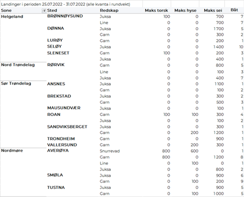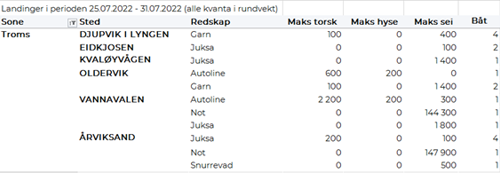 Vi tar også med landinger av fryst råstoff i uke 30 som bare delvis er omsatt. Totalt 2.118 tonn er levert til nøytrale fryselager i uke 30, ned fra 10.655 tonn uka før. Av dette kvantumet var det 647 tonn torsk, deretter fulgte 486 tonn reke, 371 tonn snabeluer og 325 tonn hyse. Fangstene var levert av 4 trålere, 3 snurrvadbåter og en autolinebåt.