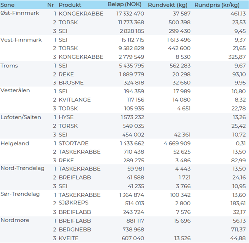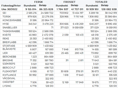 Omsetningen av ferskt råstoff i uke 30 utgjorde 86 millioner kroner, ned fra 90 millioner kroner uka før. Seien var størst i verdi med 24,6 millioner kroner av et kvantum på 2.585 tonn. Torsken fulgte tett på med 22,2 millioner av et kvantum på 980 tonn.