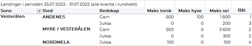 Tabell 2: Omsetning for norske båter i uke 30, 2022, fordelt pr fersk/fryst og pr fiskeslag.