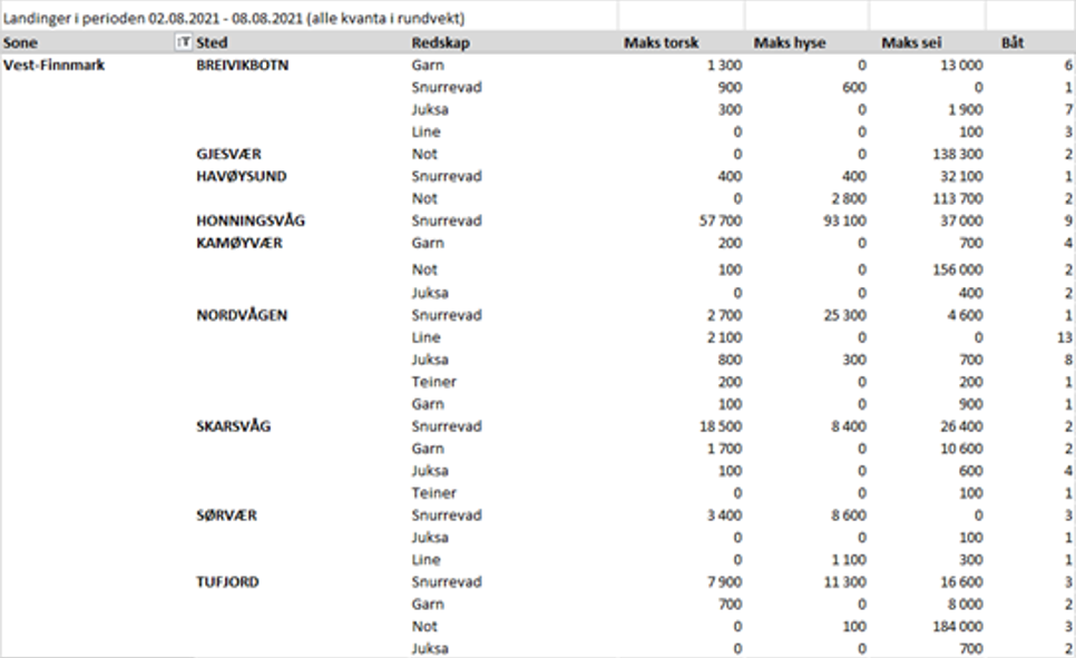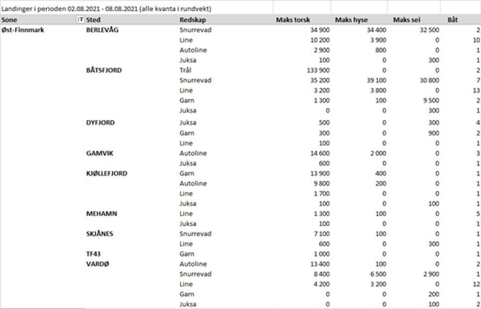 Omsetningen i uke 31 nådde 115 mill kroner, opp fra 105 mill kroner uka før. Av totalen i uke 31 kom 5 millioner fra to russiske autolinebåter. Omsetningen for norske båter var 110 mill kroner, fordelt med 84 på fersk og 25 på fryst råstoff.