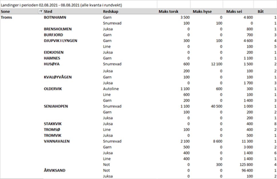 Omsetningen av kystreker i uke 31 utgjorde 24 tonn/2,4 mill.kroner. Av totalen var 20 tonn koktreke og resterende råreker til pilling. Det var 29 båter som stod for disse leveransene. 3,9 tonn var fisket i Lyngenfjorden, 3,8 tonn i Ullsfjorden, 2,9 tonn i Mehamnsfjorden. 2,7 tonn i Glomfjorden og 1,9 tonn i Altafjorden.