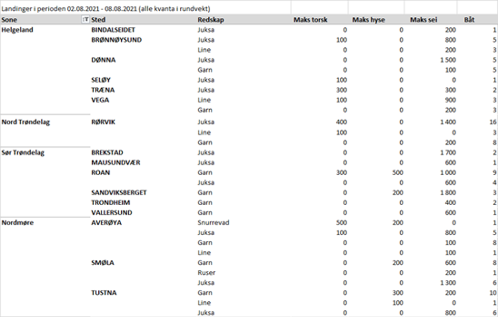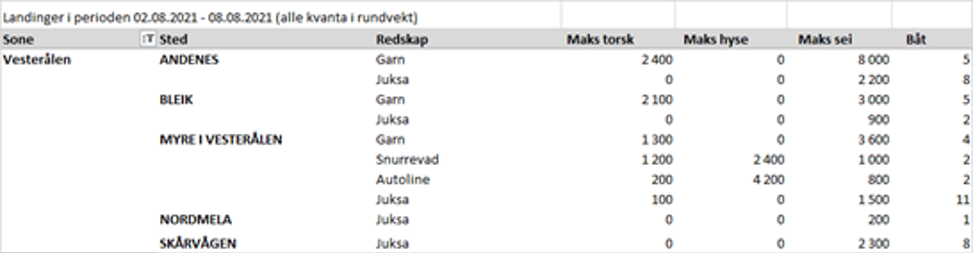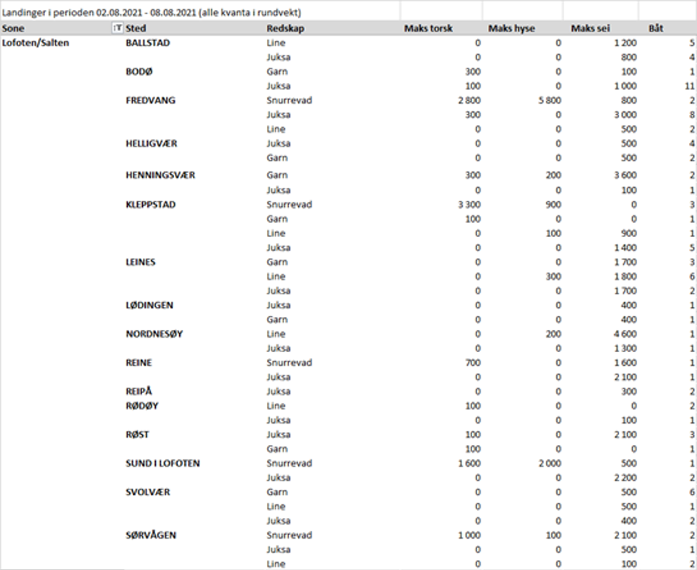 Fisket fordelt på fiskevær i Råfisklagets distrikt for uke 31 i 2021 med fokus på torsk, hyse og sei, framgår av tabellene nedenfor. Oversikten viser største enkeltfangst i rund vekt per sted for de ulike redskapene og antall båter per redskap per sted.