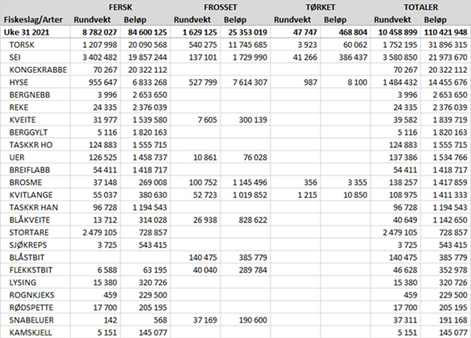 Omsetningen av ferskt råstoff i uke 31 utgjorde totalt 84,6 mill kroner, opp fra 67,7 mill kroner uka før. Av omsetningen i uke 31 kom 32 mill kroner etter leveranser i Øst-Finnmark, 26 mill kroner i Vest-Finnmark. Det meste av verdiene i Øst-Finnmark kommer fra kongekrabbe og torsk som står for hhv. 14 og 13 mill kroner. For Vest-Finnmark er det seien som dominerer og står for 11 mill av totalen, etterfulgt av torsk med 5 mill kroner. Lengre sør i Troms, Vesterålen, Lofoten, er det i likhet med Vest-Finnmark seien som bidrar mest til verdiene med en samlet verdi på 6,7 mill kroner, det meste i Troms. På Helgeland er det taskekrabben som dominerer, i Trøndelag leppefisk og breiflabb på Nordmøre.