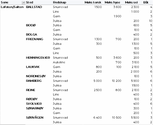 Tabell 2 og 3 viser fordelingen av landingene av fersk torsk per leveringssone og redskap (unntatt trål), med tilhørende snittpriser. De to tabellene er basert på omsetning av kvalitet A og ekstra, der alle leveringstilstander inngår, men der snittprisene er omregnet til sløyd uten hode-priser, eksklusivt restråstoff.