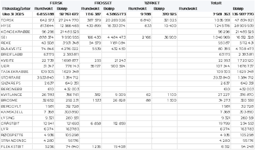Råfisklagets omsetning hittil i år, per 03. august 2025, er 14.466 millioner kroner. Det er fordelt med 12.065 millioner kroner for norske båter, og 2.401 millioner kroner for utenlandske. Tilsvarende for fjoråret var 11.769 millioner kroner totalt, hvorav 9.710 var etter landinger fra norske båter og 2.059 for utenlandske båter.